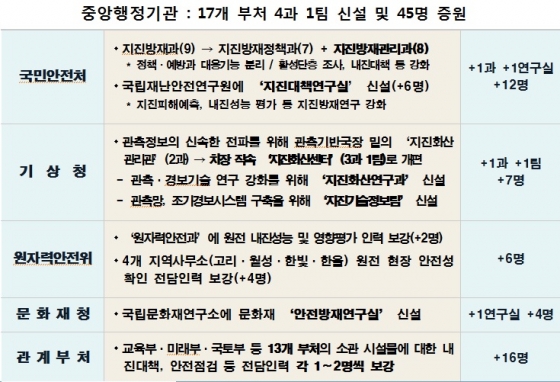 중앙부처 17곳에 전문인력 45명, 16개 시·도에 전문인력 57명 확충…국민안전처 '지진방재관리과' 신설
