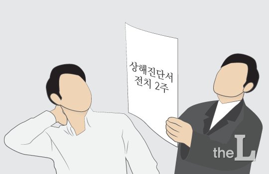 그 중에서 특히 전치 2주 상해 진단서가 문제다. 왜냐하면 염좌상, 타박상 등의 경우에는 육안으로 상처가 확인되지 않고 방사선 촬영에서도 뚜렷이 나타나지 않기 때문이다. 그래서 의사는 환자 본인의 진술(문진)과 통증호소(촉진, 즉 환부에 접촉하여 통증 여부 확인) 등에 의존하여 전치 2주 상해 진단서를 쉽게 발급해 주곤 한다. 목이 아프다고 하면 경추부 염좌, 허리가 아프다고 하면 요추부 염좌… 이런 식이다.