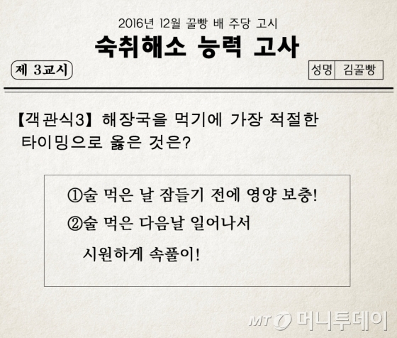 연말연시를 맞이하야 7일 7술을 하다 보니 이제는 아침에 눈꺼풀을 위로 올릴 기력조차 상실. 이대로 출근했다간 버스에서 토할 것 같은 여러분을 위한 깜짝 퀴즈! 숙취는 어떻게 풀어야 할까?