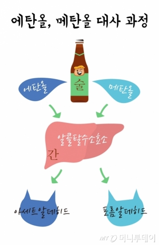 술을 마시면 몸속에 에탄올;과 메탄올이 들어와. (메탄올은 위험한 녀석이지만 국내에서는 주류 100ml 기준으로 종류에 따라 최대 0.5g~1.0g까지 포함이 허용 돼) 매일 혹사당하고 있는 우리의 간은 알코올탈수소효소를 이용해 에탄올, 메탄올을 분해하지. 분해된 에탄올은 아세트알데히드로 메탄올은 포름알데히드로 변신해.