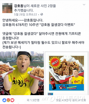 댓글은 무려 6만 건을 넘기며 네티즌들의 큰 관심을 받았다. 하지만 이에 대해 강호동의 치킨브랜드 '강호동 678'은 공지를 통해 "본사에서는 페이스북으로 이벤트를 진행하고 있지 않다"며 "고객분들께서도 이점 확인하시고, 강호동 또는 강호동678치킨을 사칭하는 이벤트에 현혹되지 않으시기를 당부 드립니다"고 말했다
