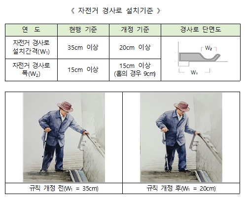 이에 따라 지하철 역사사 등의 계단에 설치되는 자전거 경사로 중심과 벽면 사이 최소간격이 0.35m에서 0.2m로 축소된다. 시각장애인, 고령자들이 계단 손잡이를 이용할 때 자전거 경사로가 발에 걸리는 불편을 최소화 하기 위해서다.