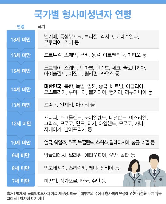또 현행 형법 9조는 만 14세 미만의 미성년자는 형사미성년자로 분류해 범죄를 저질러도 형사처벌을 받지 않도록 규정하고 있다. 형법이 제정·시행된 1953년부터 유지돼온 조항이다. 만 10세부터 14세 미만의 촉법소년은 소년법에 따라 전과기록이 남지 않는 보호처분만 받는다. 만 9세 이하는 형사처벌은 물론 보호처분도 받지 않는다.