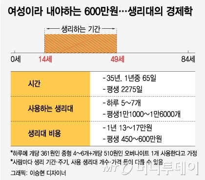 평균 35년, 1년 중 65일, 여성은 생리를 한다. 평생 1만6000개 정도의 생리대를 사용하며 이를 위해 600만원 정도를 쓴다.