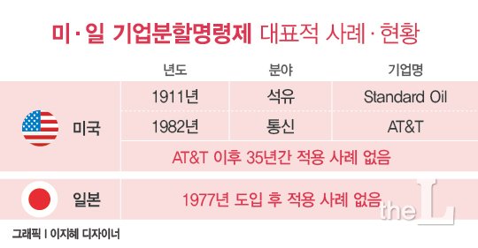 기업분할 명령제가 도입된 일본도 이런 이유들 때문에 실제 기업분할 명령이 내려진 사례가 없다. 미국 역시 1982년 대형 통신사 AT&T에 대해 기업분할 명령이 내려진 뒤 35년 동안 적용 사례가 없는 실정이다.