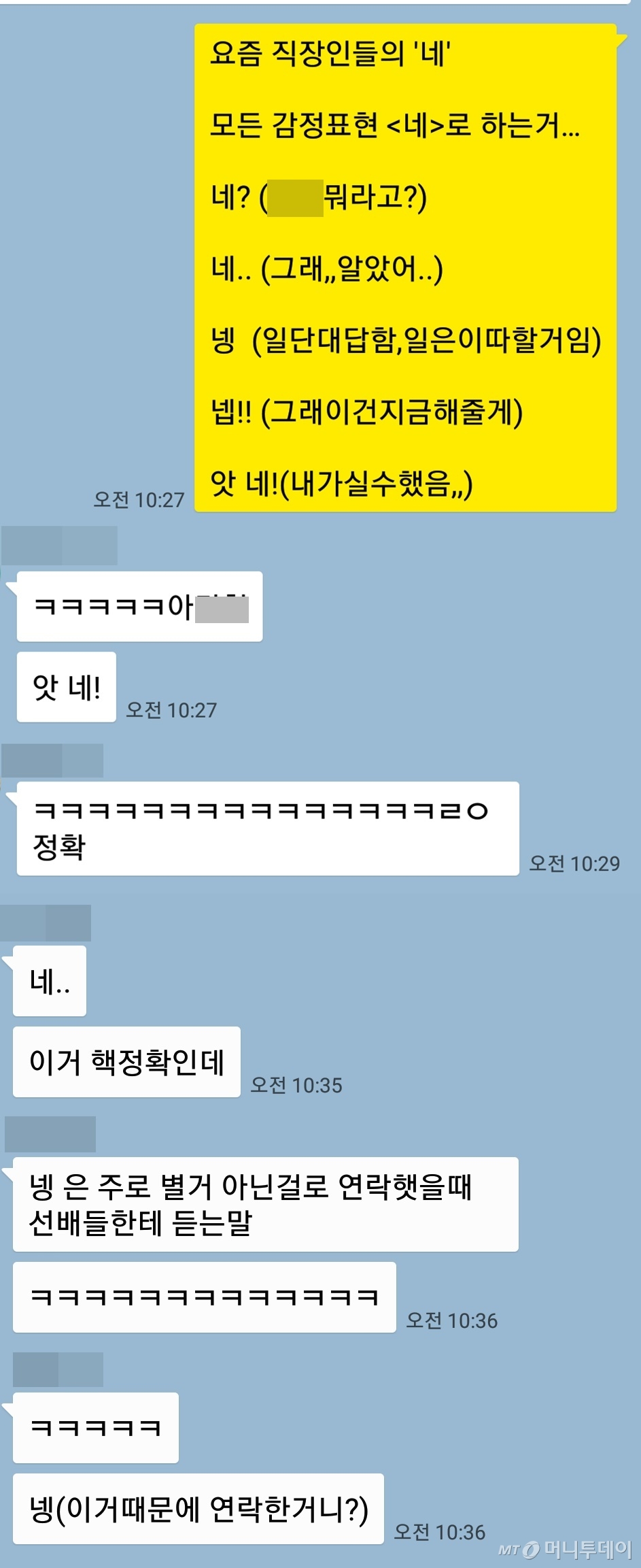 누리꾼들은 "내 카톡방 보는 줄 알았다", "'네'라고 하면 뭔가 심심하고 성의 없어 보이는데 '넵'은 신뢰감도 주고 성의도 있어 보인다", "얼굴 보고 이야기하는게 아닌 글이다보니 좀 더 활기차게 알겠다는 표현을 하려고 넵을 쓴다", "길게 쓰긴 바쁘고, 짧게 쓰면서 그나마 제일 성의 있어 보이는 대답"이라며 공감했다.