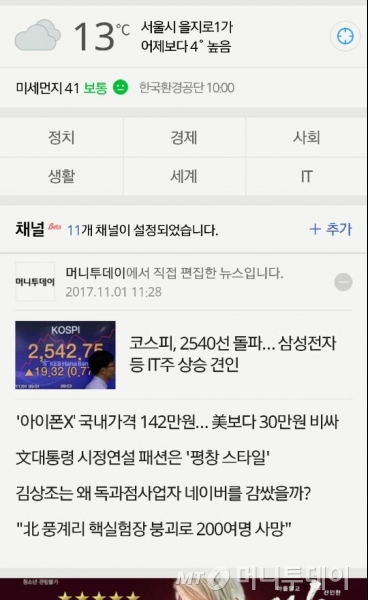 모바일 네이버 첫 화면에서 머니투데이 주요뉴스를 받아 본다?