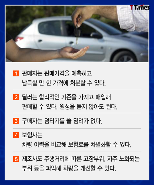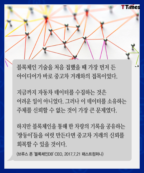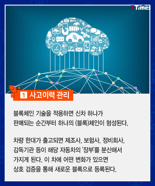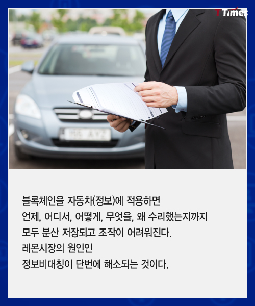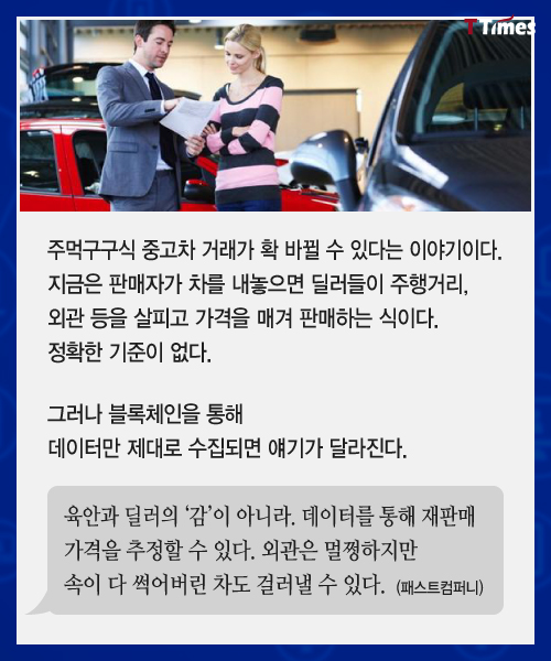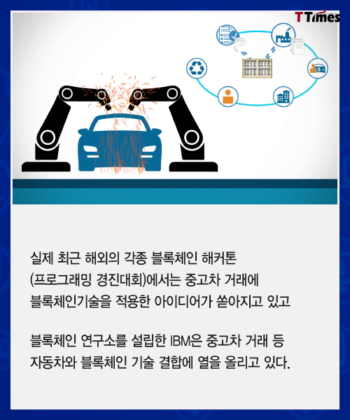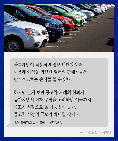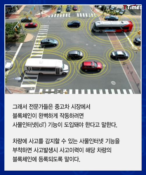 블록체인 기술이 금융뿐 아니라 부동산, 물류, 식품 유통, 의료 전 분야에서 적용이 시도되고 있다. 블록체인을 적용하면 중고차 시장일 어떻게 달라질 수 있을지 살펴본다. 독자들의 PICK! 허니문 베이비 '출생의 비밀'...결혼 직전 전남친 만난 아내 임신한 고3 아내에 "살찌면 죽일 것" 막말…부부관계 중 게임까지 소유, 임영웅과 '제주도 열애설' 전말 공개 '음주 뺑소니' 김호중, 옥중 50억 돈방석?…지분가치 '반전'