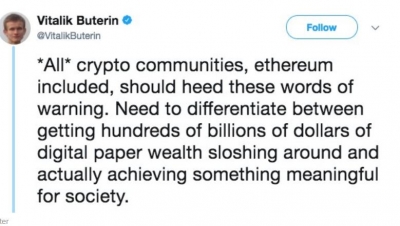 27일(현지시간) 부테린은 자신의 소셜네트워크서비스(SNS) 트위터에 "이더리움을 포함한 '모든' 암호화폐 커뮤니티에 경고를 보낸다"로 시작되는 글을 올려 무분별한 투기에 대해 경고했다. 이 글에서 부테린은 "(암호화폐 이용자들은) 돈을 물 쓰듯이 쓰는 듯한 (착각을 가져다 주는) 디지털 화폐 세상에서 수억달러를 버는 것과 현실 세상에서 의미있는 무언가를 획득하는 것이 (다르다는 것을) 분명히 구분해야 한다"고 조언했다.