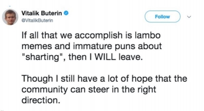 부테린은 "현재 암호화폐 커뮤니티의 문화가 잘못된 방향으로 가고 있다"며 이용자들이 고급 승용차 등 사치에만 관심을 가지고 부적절한 농담만을 주고받고 있다고 지적했다.