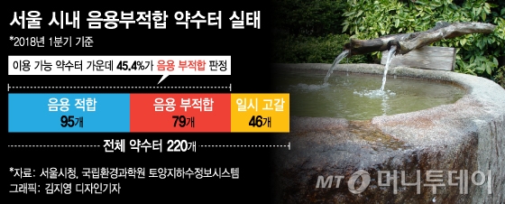 22일 서울시청과 국립환경과학원 토양지하수정보시스템(SGIS) 등에 따르면 올 1분기 서울시에 등록된 220개 약수터 가운데 79개가 '음용부적합', 95개가 '음용적합' 판정을 받았다. 220개 약수터 가운데 46개는 물이 일시적으로 고갈된 곳으로 실제 물이 흐르는 약수터는 174개다. 시민들이 이용 가능한 약수터 가운데 45.4%는 오염된 셈이다.