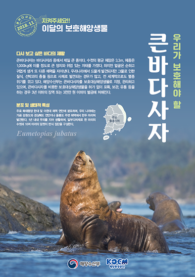 이달의 보호해양생물로 선정된 큰바다사자를 비롯한 보호대상해양생물에 관한 정보는 바다생태정보나라 누리집(www.ecosea.go.kr)에서 확인할 수 있다.