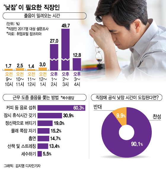수면시간이 부족한 탓에 근무 중 졸음을 느끼는 직장인도 많다. 취업포털 잡코리아가 남녀 직장인 2017명을 대상으로 진행한 '직장인 낮잠' 설문 조사 결과, 응답자의 97.3%가 근무 시간에 졸음을 느낀 적 있다고 답했다. 그렇지 않다고 답한 직장인은 2.2%에 불과했다.