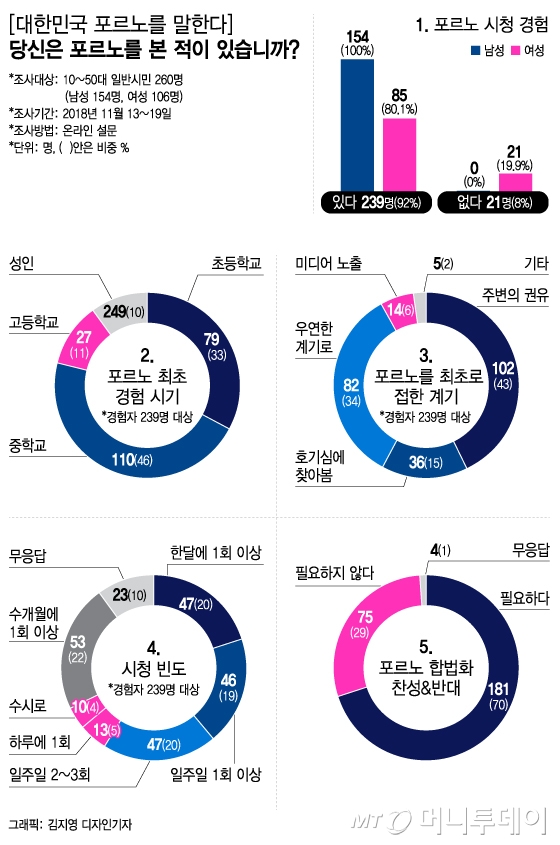 금기시하는 문화와 달리 머니투데이가 이달 13일부터 19일까지 10~50대 260명(남성 154명, 여성 106명)을 대상으로 진행한 인터뷰에서는 포르노가 일상 깊이 스며든 모습을 확인할 수 있었다. 전체 응답자 중 '포르노를 본 적이 있다'고 대답한 사람은 239명(92%)이다. 남성 응답자는 전원이 '포르노를 본 적이 있다'고 답했다.