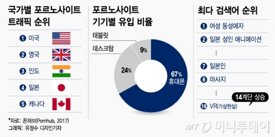 반면 일반 컴퓨터(PC) 접속은 24%에 그쳤다. 포르노와 소비자를 연결하는 매체가 책에서 비디오, PC를 거쳐 스마트폰으로 옮겨갔다. 폰허브 검색어 순위에서도 포르노 산업의 변화는 감지된다. 지난해 상위 20개 검색어 중 'VR'은 전년대비 14계단 상승해 16위에 올랐다.