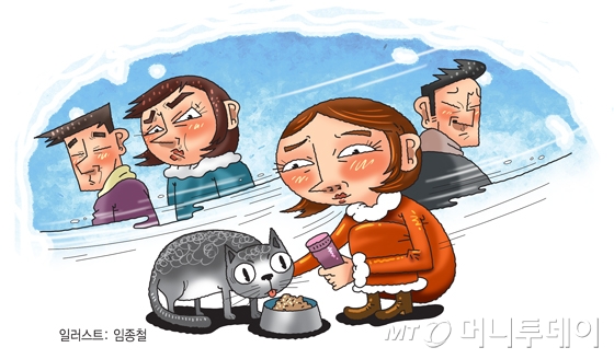 "뭐하세요?"라는 물음에, 골목에 쪼그려 앉아 있던 한 여성이 화들짝 놀라며 뒤를 돌아봤다. 별 일 아니라며 일어난 여성은 쫓기듯 빠른 걸음으로 떠났다. 앉아 있던 자리엔 사료와 물이 가지런히 놓여 있었다. 굶주리는 '길냥이'(길+고양이)를 돌보는 '캣맘'이었다.