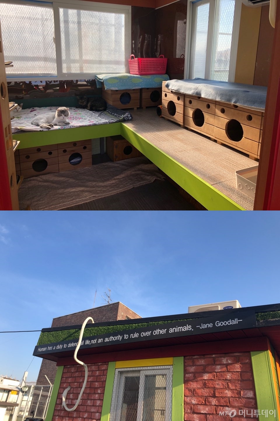 지난 19일 찾은 리본센터 옥상에는 김미자 미우캣보호협회 회장이 고양이들 사료를 챙기고 있었다. 구청 옥상에서 옮긴 쉼터시설과 서울시의회에서 지원한 시설 두 채에 고양이들이 들어가 휴식을 취하고 있었다. 커다란 배변모래판을 비롯, 주변 환경은 청결한 상태였다. 악취라고 코를 찌푸릴법 한 냄새는 나지 않았다. 이날 오전에도 봉사자들이 모여 쉼터 청소를 했기 때문이다.