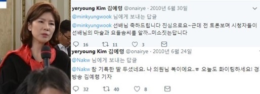 김 기자는 2010년 나 원내대표에게 "참 기특한 딸을 두셨네요. 나 의원님 복이에요. 오늘도 화이팅 하세요"라며 응원을 전했다. "경기방송 김예령 기자"라는 소개 문구도 덧붙였다. 앞서 민 의원에게는 "선배님 축하드립니다. 진심으로요. 저는 토론을 보며 시청자들이 선배님의 마술과 요들솜씨를 알까, 미소짓는답니다"라는 트윗을 보내며 친분을 과시했다.