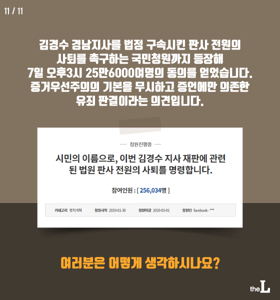김경수 경남지사를 법정 구속시킨 판사 전원의 사퇴를 촉구하는 국민청원까지 등장해 7일 오후 2시 25만명의 동의를 얻었습니다. 증거우선주의의 기본을 무시하고 증언에만 의존한 유죄 판결이라는 의견입니다.