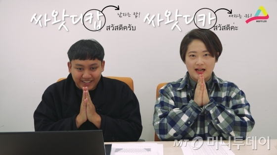 앞에는 남자 인사말인 '??????????'(싸왓디캅)이고, 뒤에는 여자 인사말인 '?????????'(싸왓디카)야. (이번 기회에 알아뒀다가 태국에 놀러갔을 때 잘 써먹어봐!)