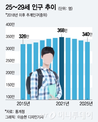 16일 통계청에 따르면 2016년 328만명이었던 25~29세 인구는 2017년(337만명)부터 늘기 시작해 2021년 368만명으로 정점을 찍는다. 1980년대 말 산아제한정책이 풀리면서 출생아가 급증했고, 이같은 추세는 1998년 IMF(국제통화기금) 외환위기까지 이어졌다.