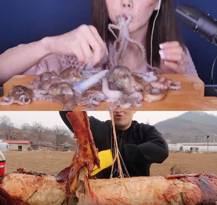 이처럼 최근 음식을 손질하지 않은 채 통째로 먹는 방송이 유행처럼 번지고 있다. 생고기, 회를 썰지 않고 먹는 것은 물론 100kg 돼지를 통째로 뜯어 먹는 먹방까지 등장했다. 대형문어를 통째로 삶아먹는 유튜버 엠브로의 '초대왕문어 크라켄 40kg 한마리 통 먹방'은 조회수가 188만을 넘어섰다.