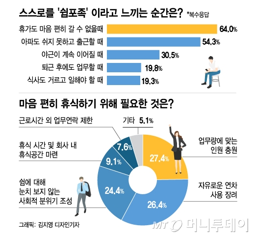 스스로 쉼포족이라고 느끼는 순간이 있냐는 질문엔 '휴가도 마음 편히 갈 수 없을 때'(64%, 복수응답)라는 답이 가장 많았다. 직장인 A씨(26)는 "연차 쓸 때마다 눈치 보여서 그냥 쉬는 걸 포기했다"라며 "유렵여행 가고 싶다고 슬쩍 이야기를 꺼냈더니 상사가 '퇴사해야지 그럼'이라고 했다. 그 후로 연차 내는 게 더 불편해졌다"고 토로했다.