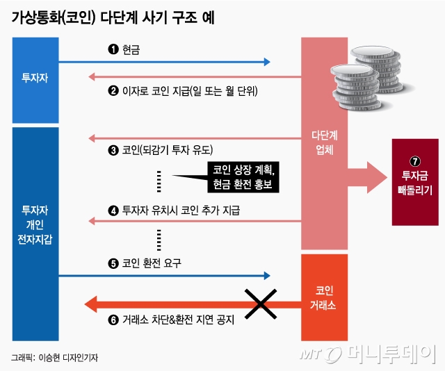전문 다단계 사기꾼 일당인 이들은 '코인'의 이름만 바꿔가며 투자자를 끌어모았다. 경찰에 검거되지 않은 일당 중 일부는 전국을 돌며 사기를 벌이고 있어 피해 규모는 더욱 커질 전망이다.