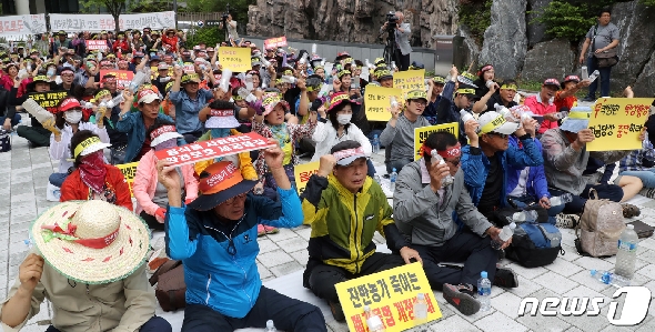 (세종=뉴스1) 장수영 기자 = 전국음식물사료축산연합회 회원들이 10일 정부세종청사 농림축산식품부와 환경부 앞에서 집회를 갖고 아프리카돼지열병과 관련 잔반 사료를 금지하는 정책을 반대하고 있다.