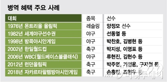 대표적으로 2002년 한·일 월드컵 4강 진출로 국가대표팀이 병역혜택을 받았던 전례가 있다. 국가대표팀이 사상 처음으로 16강에 진출하면서 병역특례 요구가 있었고 당시 김대중 대통령에게 주장이었던 홍명보 선수가 팀을 대표해 직접 건의하기도 했다. 2006년 월드베이스볼클래식(WBC) 야구 국가대표팀도 4강에 진출해 병역을 면제받은 바 있다.