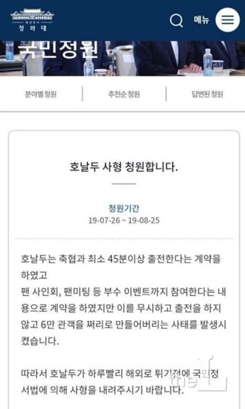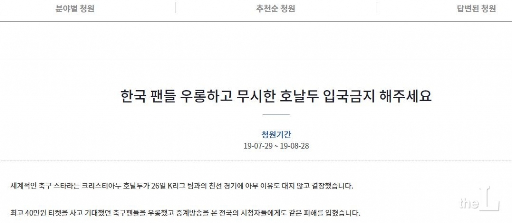 [the L]청와대 국민청원에 '호날두 입국금지·사형' 올라오기도