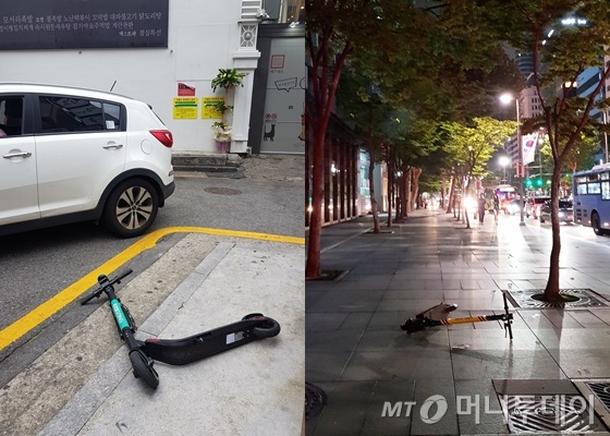 강남 곳곳에서 전동킥보드가 보행로 위에 무분별하게 주차된 모습을 쉽게 찾아볼 수 있었다. 보행로 한가운데 놓여있어 보행자들이 통행에 불편을 겪는 것은 물론 가게 앞에 출입문을 막고 세워져 있어 영업을 방해하기도 했다. 쓰러진 채 방치돼 있는 전동킥보드도 여럿이었다.