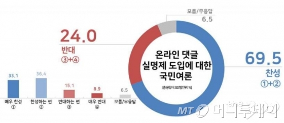 여론조사 전문기관인 리얼미터가 인터넷 댓글 실명제 도입에 대한 국민여론을 조사한 결과, 찬성(매우 찬성 33.1%, 찬성하는 편 36.4%) 응답이 69.5%로 집계됐다. 반대(매우 반대 8.9%, 반대하는 편 15.1%) 응답(24.0%)의 세 배에 가까운 것으로 수치였다. '모름/무응답'은 6.5%였다.