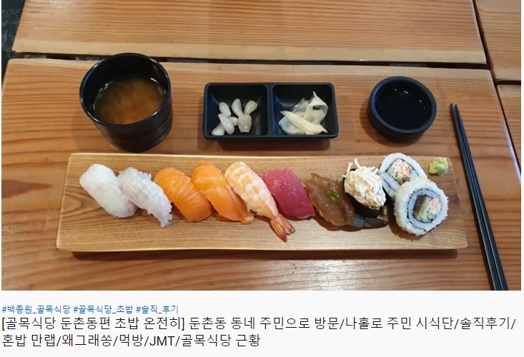 앞서 둔촌동 초밥집은 연어, 장어, 초새우, 참다랑어, 간장새우, 우동 등으로 구성된 모둠초밥 정식을 1만5800원에 판매했다. 백종원과 김성주는 초밥의 맛을 독보적이라고 평가하기도 했다.