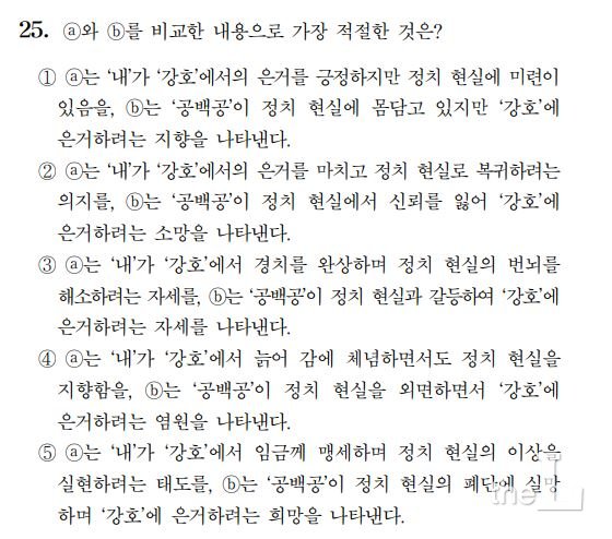 18일까지 접수를 마친 한국교육과정평가원 수능 이의신청 게시판에도 국어 25번과 관련된 이의신청이 접수됐다. 논란이 된 국어 25번에서는 신계영이 지은 고전시 ‘월선헌십육경가' 중 '강호에서 어조와 새 맹세가 깊었으니 / 옥당금마(관직 생활)에 몽혼(꿈)이 섞였다'라는 구절의 해석이 문제였다.