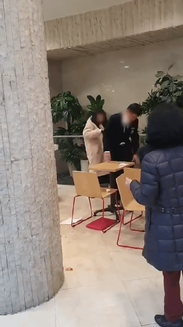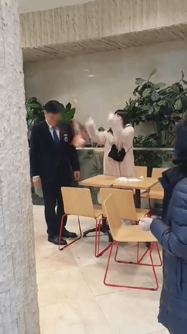 보안요원은 평정심을 잃지 않고 응대를 계속했지만 여성은 보안요원에게 음식이 담긴 트레이를 집어던진 후 테이블과 의자를 넘어뜨리며 소리를 질렀다. 분이 안 풀린 듯 테이블을 정리하려는 보안요원의 옷을 잡고 흔들기도 했다.