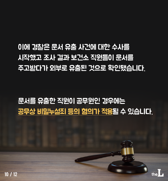 이에 경찰은 문서 유출 사건에 대한 수사를 시작했고 조사 결과 보건소 직원들이 문서를 주고받다가 외부로 유출된 것으로 확인됐습니다. 문서를 유출한 직원이 공무원인 경우에는 공무상 비밀누설죄 등의 혐의가 적용될 수 있습니다.