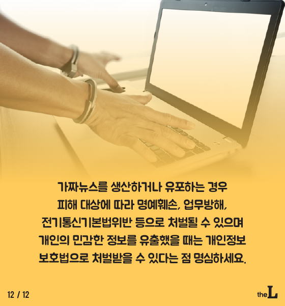 가짜뉴스를 생산하거나 유포하는 경우 피해 대상에 따라 명예훼손, 업무방해, 전기통신기본법위반 등으로 처벌될 수 있으며 개인의 민감한 정보를 유출했을 때는 개인정보 보호법으로 처벌받을 수 있다는 점 명심하세요.