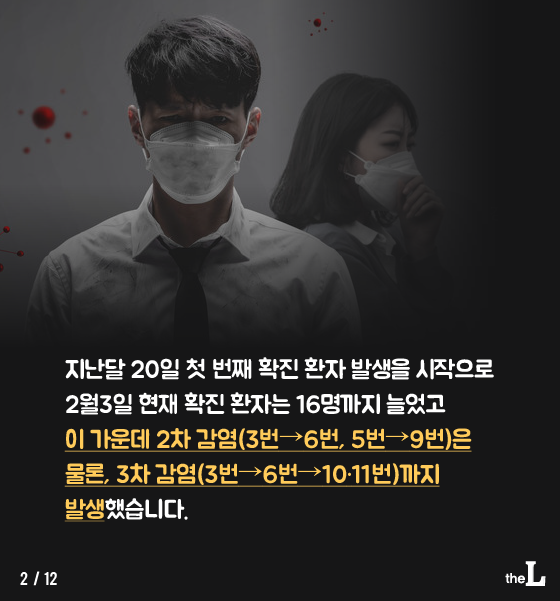지난달 20일 첫 번째 확진 환자 발생을 시작으로 2월3일 현재 확진 환자는 16명까지 늘었고 이 가운데 2차 감염(3번째→6번째, 5번째→9번째)은 물론, 3차 감염(3번째→6번째→10·11번째)까지 발생했습니다.