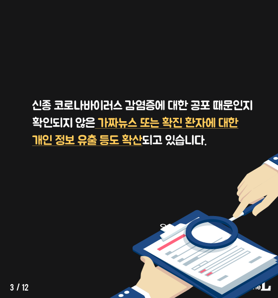 신종 코로나바이러스 감염증에 대한 공포 때문인지 확인되지 않은 가짜뉴스 또는 확진 환자에 대한 개인 정보 유출 등도 확산되고 있습니다.