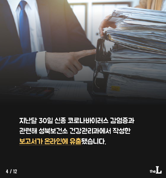 지난달 30일 신종 코로나바이러스 감염증과 관련해 성북보건소 건강관리과에서 작성한 보고서가 온라인에 유출됐습니다.