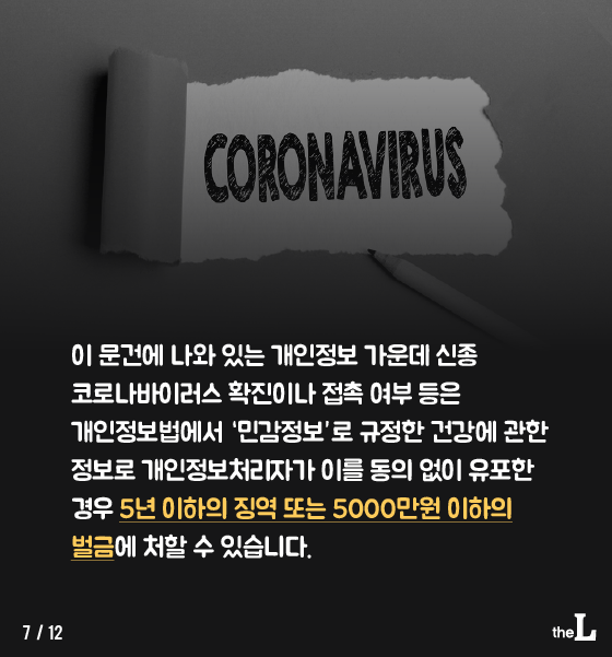 이 문건에 나와 있는 개인정보 가운데 신종 코로나바이러스 확진이나 접촉 여부 등은 개인정보법에서 ‘민감정보’로 규정한 건강에 관한 정보로 개인정보처리자가 이를 동의 없이 유포한 경우 5년 이하의 징역 또는 5000만원 이하의 벌금에 처할 수 있습니다.