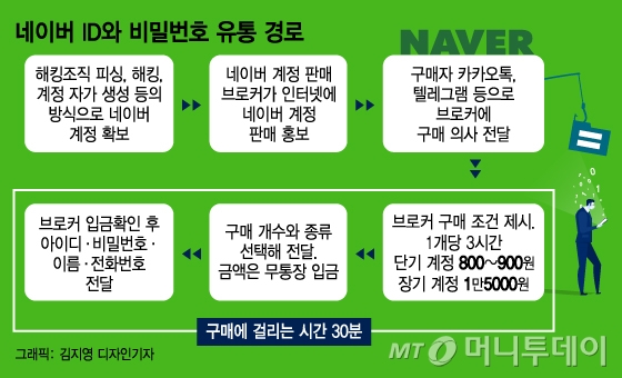 네이버 아이디와 비밀번호를 1개당 800원에 샀다. 아이디 주인의 이름과 전화번호는 덤이다. 브로커에게 구매한 네이버 계정에는 3시간 동안 접속이 가능했다. 아이디 주인의 메일 확인은 물론 댓글, 블로그 '좋아요' 등을 조작할 수 있다.