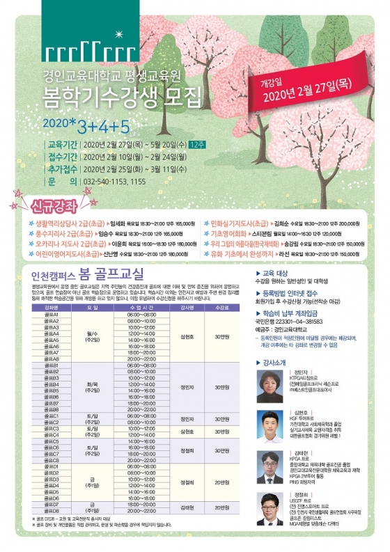 경인교육대학교 평생교육원이 10일부터 오는 24일까지 봄학기 수강생을 모집하고, 오는 27일부터 12주간 수업을 진행한다.