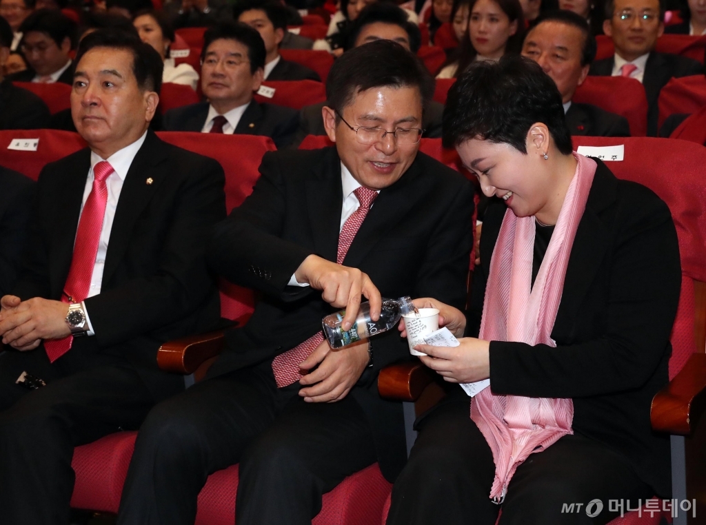 황교안 미래통합당 대표가 17일 오후 서울 여의도 국회 의원회관에서 열린 미래통합당 출범식에서 축사를 마친 이언주 전 전진당 대표에게 물을 따라주고 있다. 독자들의 PICK! 윤미래, 뒤늦게 알려진 사망 소식..."긴 여행 떠나" 추성훈, '파격' 누드 화보 공개…"돈 안 받아, ♥야노 시호도 촬영" 동서와 갈등→파혼 2번 아내..."조카는 남편 아이" 의심 충격 "남성 의사가 은밀한 곳 봤잖아" 이혼 선언…산부인과서 난동