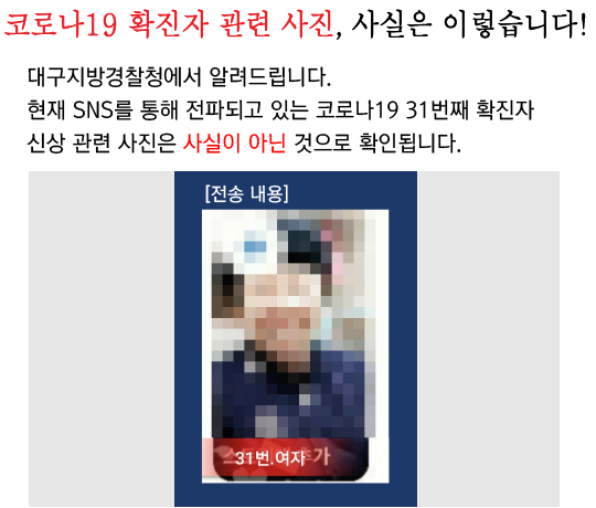 지난 19일, 31번 확진자가 퇴원을 요구하고 간호사와 몸싸움을 벌이고 있다는 소식이 인터넷 및 SNS(소셜미디어)를 통해 전파됐다. 31번 확진자라며 사진도 함께 퍼졌다. 하지만 모두 '가짜 뉴스' 였다.