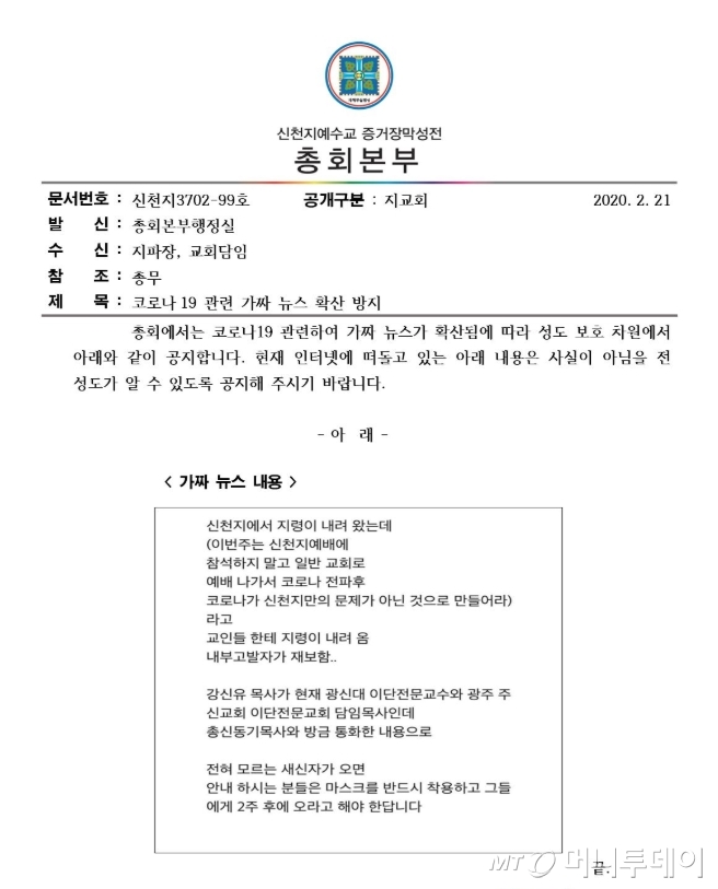"일반 교회에 가서 코로나를 전파하라"는 내용이 '신천지 지령'으로 떠돌자, 신천지가 가짜뉴스라며 즉각 해명했다.