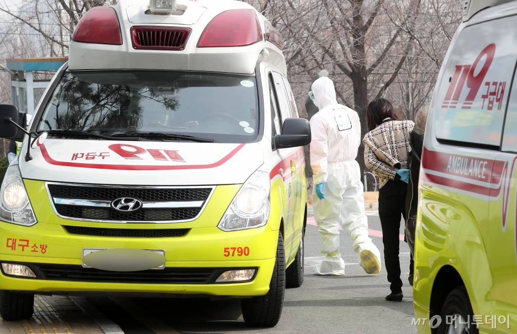 코로나19 확진자가 전일(오전 9시 기준) 대비 50명이 증가한 21일 오후 대구의료원에 구급차를 타고 온 의심 환자가 선별진료소로 이동하고 있다. /사진=김휘선 기자