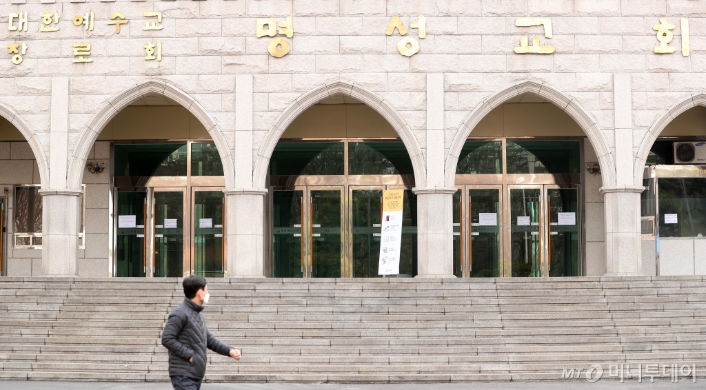 명성교회 부목사 1명과 신도 5명이 '코로나19' 확진자가 대거 발생한 경북 청도 대남병원 장례식장을 다녀온것으로 알려진 24일 오후 서울 강동구 명성교회에 주일예배를 제외한 모든 모임 중단과 새벽예배 중단 안내문구가 붙어있다. /김휘선 기자