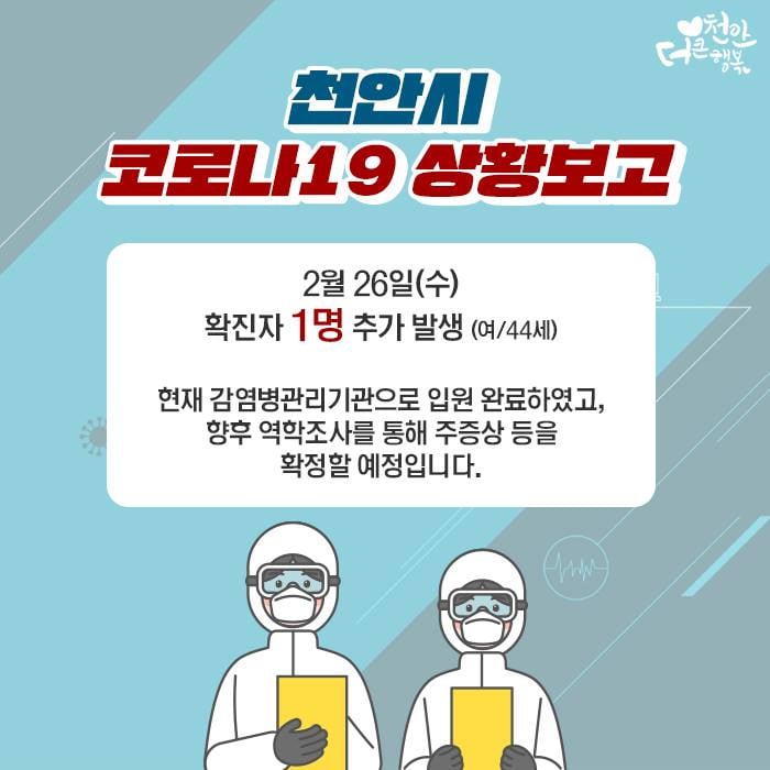 /사진=천안시 천안시는 4번째 코로나19 확진자가 44세 여성이며, 지난 23일 발병해 24일 순천향대천안병원 선별진료소에서 검체 채취 후 자가격리 중 26일 오전 9시40분 확진판정을 받았다고 밝혔다. 독자들의 PICK! '왼쪽 발목 부상' BTS RM, 깁스 사진 올리며 "ㅠㅠ" 장혁 논현동 빌딩 '286억'…75억 대출받아 11년 만에 130억↑ '외도' 아내, 25층 매달려 협박…남편, 결국 상간남 만남 허락 "확 달라진 얼굴"...김지민 퉁퉁 붓고 멍 잔뜩 '깜짝', 무슨일?